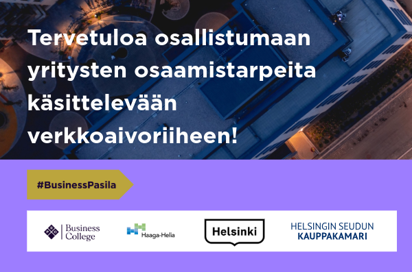 Me, Business College Helsinki, Haaga-Helia ammattikorkeakoulu, Helsingin työllisyyspalveluiden ja Helsingin seudun kauppakamari haluamme kuulla, millaista osaamista ja taitoja juuri sinun toimialasi ja yrityksesi tarvitsevat. Osallistumisenne tuottaa arvokasta tietoa yritysten osaamistarpeista ja auttaa kehittämään koulutuksen sisältöjä järjestäjille ja liike-elämän kehittäjille. Tulokset julkistetaan tiistaina 2.12. ja jaamme koosteen tuloksista digitaalisessa muodossa Business College PROn digitaalisessa ympäristössä joulukuun aikana.