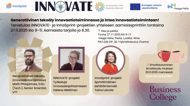 INNOVATE ja InnoSprint -projektien yhteinen aamiaissprintti to 27.11.2025 tarjoaa herkullista aamiaista sekä tuoreita tuloksia innovaatiojohtamisen maailmasta. Ilmoittaudu mukaan! Tervetuloa juhlistamaan innovaatiojohtamisen projektien tuloksia! Helsinki Business College Oy ja Haaga-Helia ammattikorkeakoulu järjestävät yhteisen INNOVATE- ja InnoSprint -projektien yhteisen aamiaissprintin torstaina 27.11.2025 klo 9–11. Aamiaista tarjolla jo 8.30. Tilaisuudessa paneudumme innovaatiojohtamiseen, esittelemme hankkeiden keskeiset ideat ja tulokset ja jaamme… -