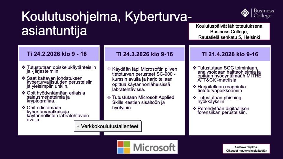 Kyberturva-asiantuntijana toimiminen (40 osp) on käytännönläheinen koulutus, jossa syvennytään tietoturvan kehittämiseen, riskienhallintaan, lakeihin ja salaukseen. Koulutuksessa hyödynnetään monipuolisesti erilaisia oppimateriaaleja ja työkaluja, kuten esimerkiksi Microsoft SC-900, Wireshark, MITRE ATT&CK, Nmap ja Burp Suite.